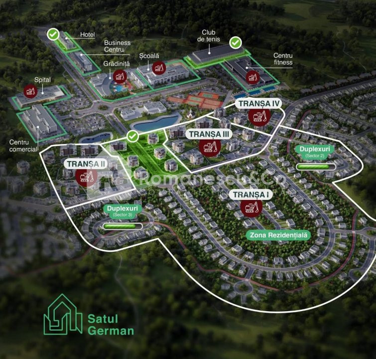 Complexul dispune de școală, grădiniță, spital și market pe teritoriu, creând condiții ideale pentru o viață confortabilă și sigură.