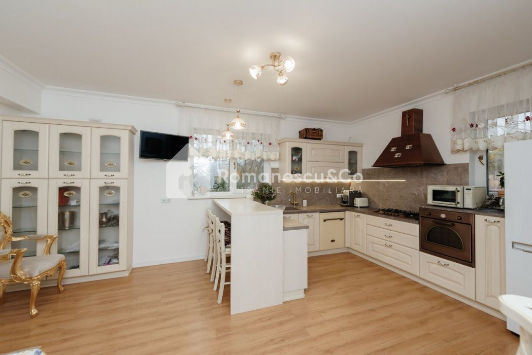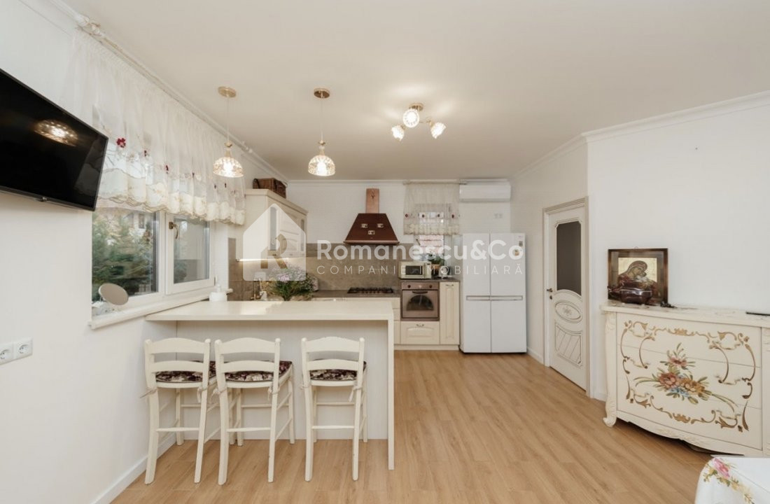 - Bucătărie open-space complet utilată — insulă cu bar, mobilier pictat