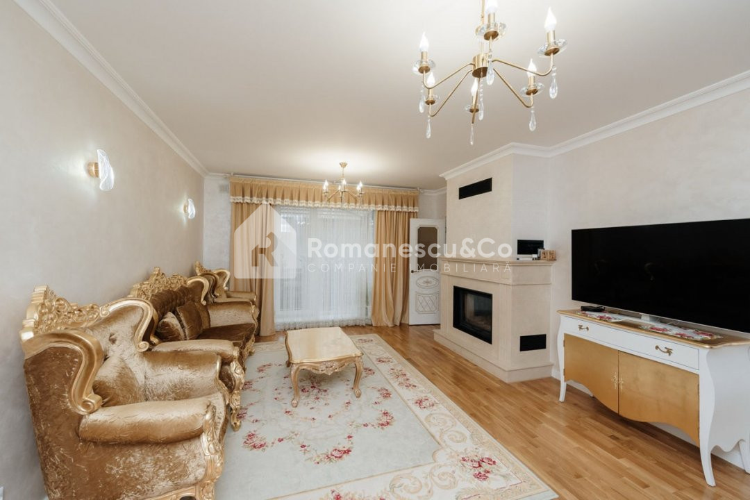 - Sufragerie spațioasă cu mobilier clasic, candelabru auriu și șemineu funcțional