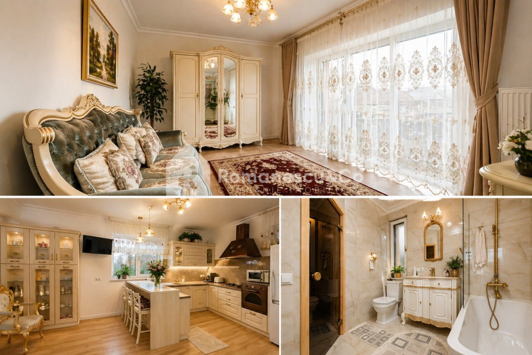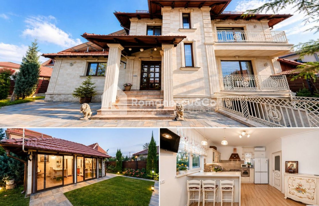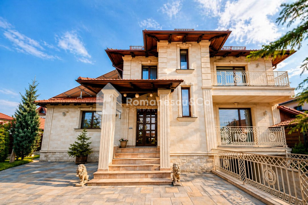 Imobilul impresionează prin fațada monumentală din piatră naturală, cu coloane, balustrade ornamentale și scări de intrare elegante — o adevărată bijuterie arhitecturală.